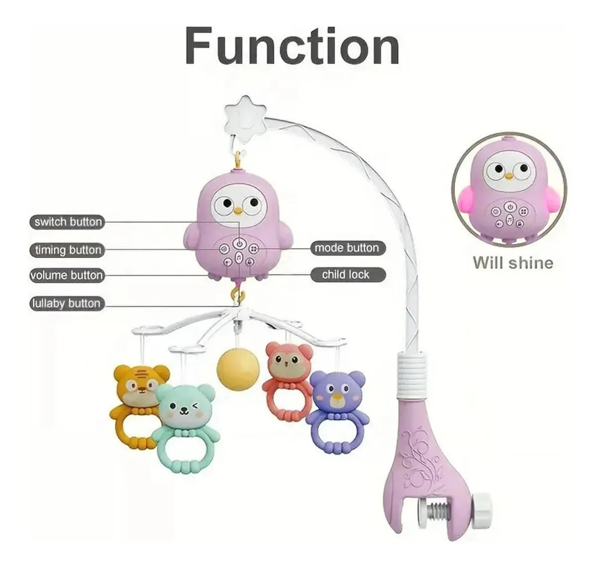 El móvil de cuna está equipado con una caja de música de volumen ajustable para reproducir canciones de cuna suaves y dulces para suavizar el estado de ánimo del bebé y acompañar al bebé a dulces sueños.